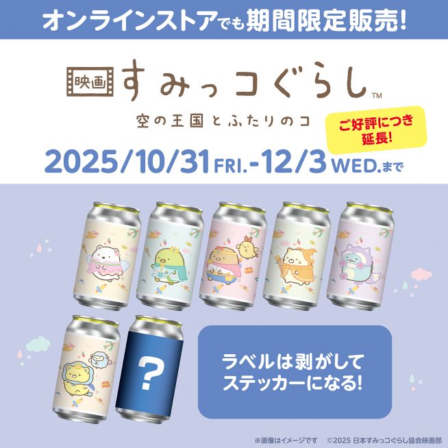 2025.11.12 オリジナルラベル缶が全国のサントリー自販機で販売開始! 『映画 すみっコぐらし 空の王国とふたりのコ』の上演を記念したオリジナルラベル缶が、全国のサントリー自販機約100箇所とオンラインストアで販売開始!ラベルはステッカーとしても活用できます!数量限定でオリジナルアクキーも当たるかも?オンラインストアでは、7本コンプリートセットを販売!オリジナルアクキーが必ずGETできます。この機会をどうぞお見逃しなく! ▼自販機設置場所はこちら ▼オンランストアはこちら ▼ 販売期間10/31(金)〜12/3(水)